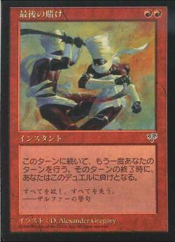 最後のチャンス 最後の賭け 戦士の宣言は全く同じ呪文で2マナで追加ターンと極めて軽いですが追加ターンする代わりに敗北という条件 オべカとかで強制終了とか白金の天使とかで敗北回避可能