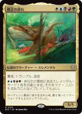 • あなたがトークンでないエレメンタル1体を生け贄に捧げるたび、それのコピーであるトークン1体を生成する。ターン終了時まで、そのトークンは速攻を得る。次のあなたの終了ステップの開始時に、白青黒赤緑を支払わないかぎり、それを生け贄に捧げる。