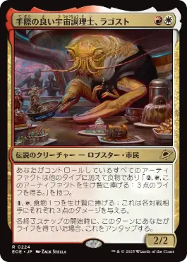 アーティファクトが全て食物トークンになり自身のタップ能力で3点のダメージかつ終了時にライフを得ているとアンタップするという独特な能力が特徴的の統率者
