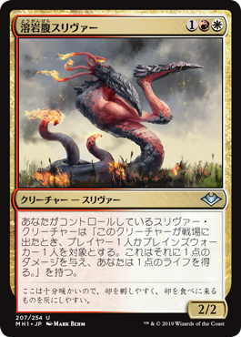 先ほど紹介した無限コンボでスリヴァーの女王と基底スリヴァーがあれば無限にトークンを出し入れ出来ます ここにダメージを飛ばせる溶岩腹スリヴァーがいると無限ダメージに